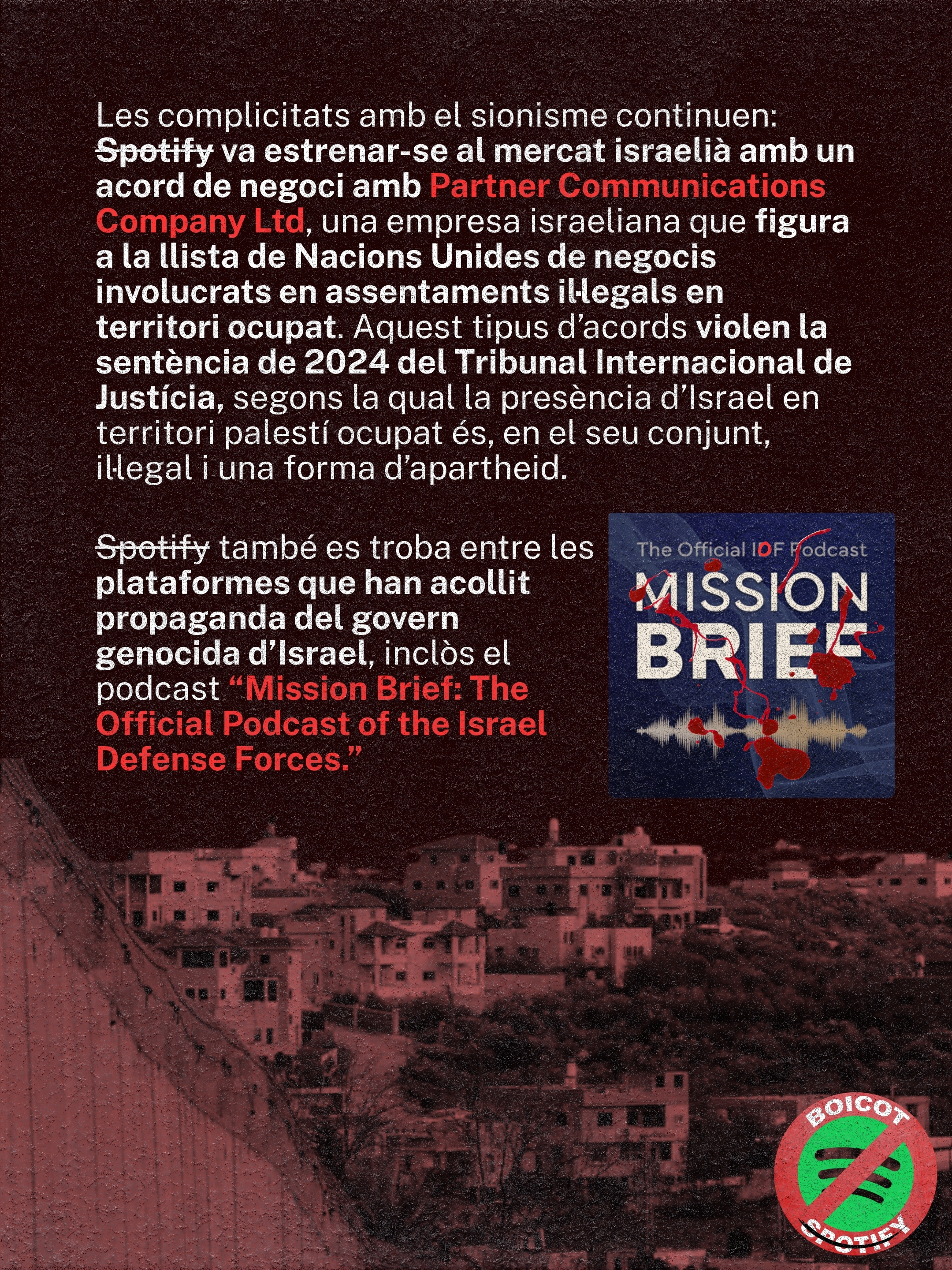 | Spotify | ✗ Daniel Ek inverteix en armament militar a través de Prima Materia | 2 - 4€ | +126M | 10.99€ / 16.99€ | ✗ | Spotify for Artists proporciona una plataforma als artistes per facilitar estadístiques, venta de merch i promoció de nous llançaments | 1 | ✗ | ✗ | ||